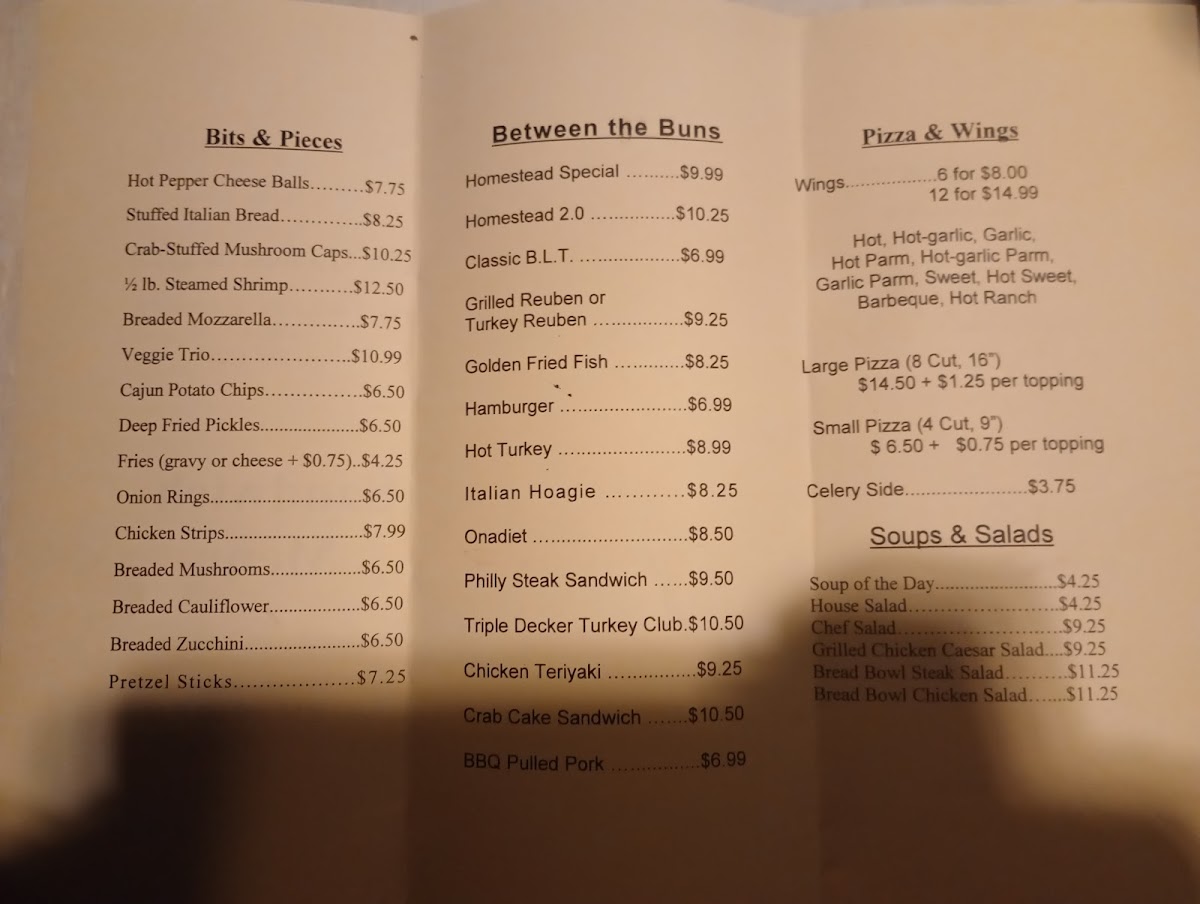 This place is a hidden gem. I lived in Johnstown my whole life, drove by this countless times but it wasn't until I attended a birthday gathering until I actually went into the Homestead. I not only went back but took my friends and family. Its a cozy setting with a home like atmosphere. The staff is very friendly and accommodating but not over bearing. The have a wide menu and out of all the dishes I seen delivered, were excellent. Their Ribeye is my favorite so far. Food was delicious, portions were generous and price cheap. The establishment is clean to include the restrooms and family friendly. If you haven't stopped at the Homestead, I highly recommend it.